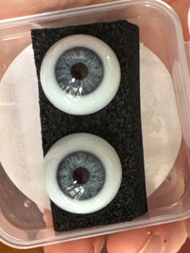 20 mm half rounds. Our own custom standard handmade eyes. Deep Blue with amazing stations and a slight blue sclera for the most tru realism.